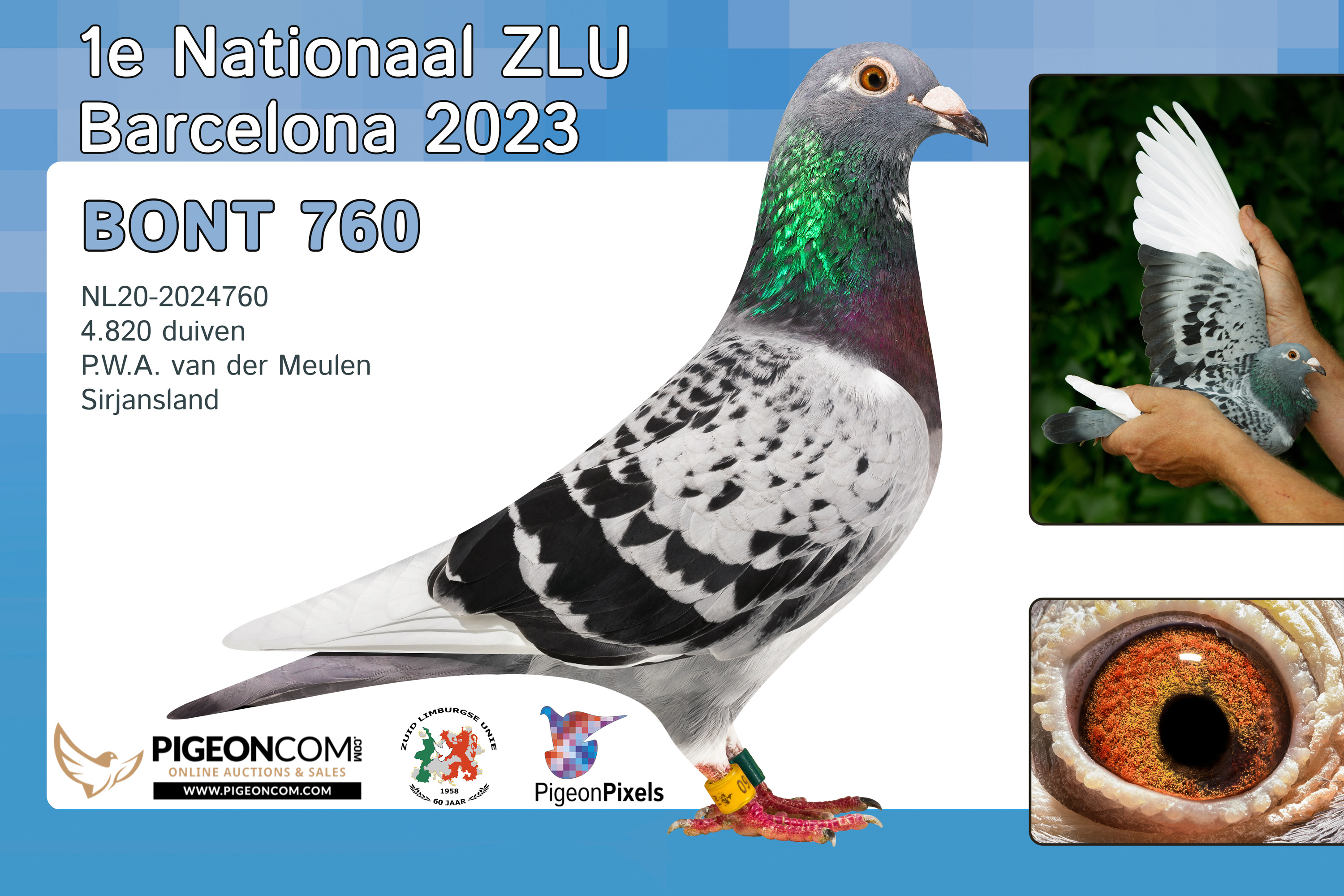 2020年德国鸽友阿林·卡尔斯库(KARSCU ALIN)的冠军鸽,领先其他赛鸽10小时归巢,飞行空距1005公里,分速为1104.46米/分,被称为“孤胆英雄”,夺得国际赛总冠军、德国冠军。这也是2020年唯一一羽分速破千米的归巢鸽。