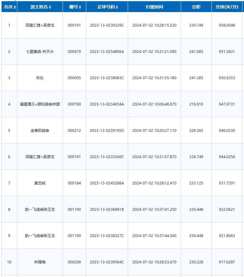 截至下午14:40,共归巢904羽赛鸽,归巢率仅13.37%。而目前百隆汇捷+吴彦龙的的一羽2023-13-0239329C,以958米/分的分速暂居榜首,可见赛事之艰。希望等气温降下来之后,能有更多归巢的鸽子。