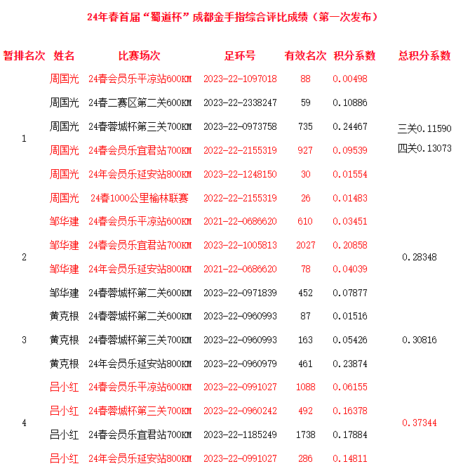 评比办法是:会员参加600公里、700公里、800公里和1000公里全市大赛,每次比赛上笼限指定1羽参赛鸽,以这羽参赛鸽获得当场比赛“有效名次”来计算“积分系数”,4场比赛“积分系数”相加,小者列前,最终排名。