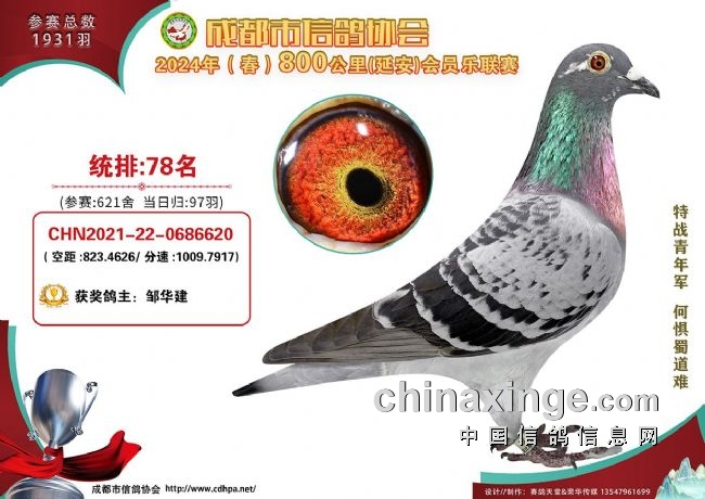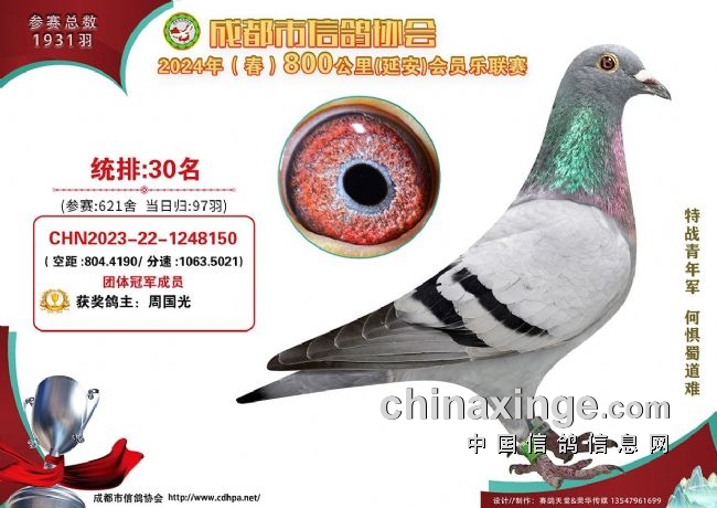 周国光每一场的指定鸽,在600公里会员乐平凉站获得88名、二赛区第二关获得59名,700公里蓉城杯第三关获得735名、会员乐宜君站927名,800公里延安站获得30名,1000公里榆林站获得26名,他也是唯一参加六场成都市联赛,并且“唯一指定鸽”都入围的鸽友。同级别比赛取最佳战绩,最终他的指定积分为三关总积分系数0.1159、四关总积分系数0.13073,荣获“蜀道杯”总冠军,成为今年成都市“最能读懂自己爱鸽的真正赛鸽人”。