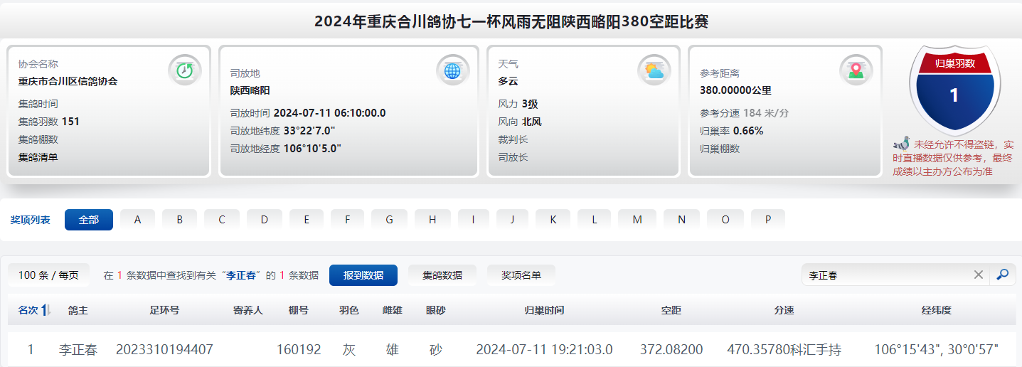 从略阳到合川,除中途营山有雨外,沿途(车行路线)都是晴天,温度也不高,只是闷热,湿度大,很多鸽友从12点多钟上楼等鸽,等得头昏眼花、汗流浃背,结果到下午19点多都没有鸽子回来。就在大家都以为全部洗白了的时候,老鸽友李正春回来一羽灰雄砂眼,环号2023310194407,19点21分03秒归巢时间自动上传成功,空距372.082公里,分速470.358米/分。