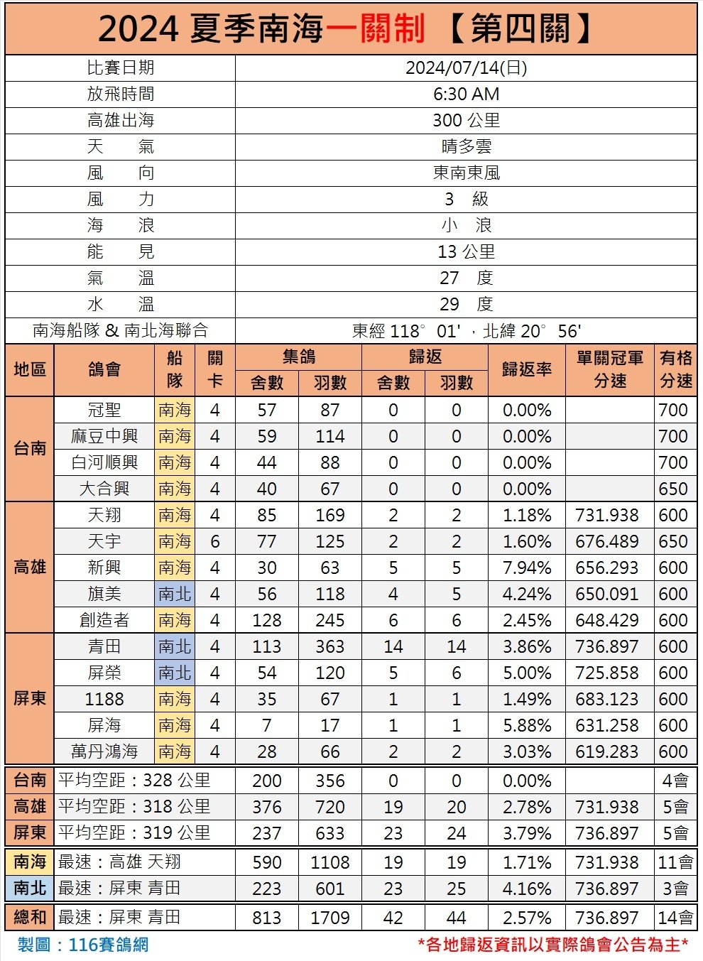 本场比赛共有来自台南、高雄、屏东地区14家鸽会参赛上笼,总计813家鸽舍、1709羽赛鸽。但最终仅有42家鸽舍、44羽赛鸽有效归巢,总归巢率为2.57%,是一关制开赛以来归巢率最低的一关。单关冠军分速为736.897米/分,来自屏东区青田鸽会。