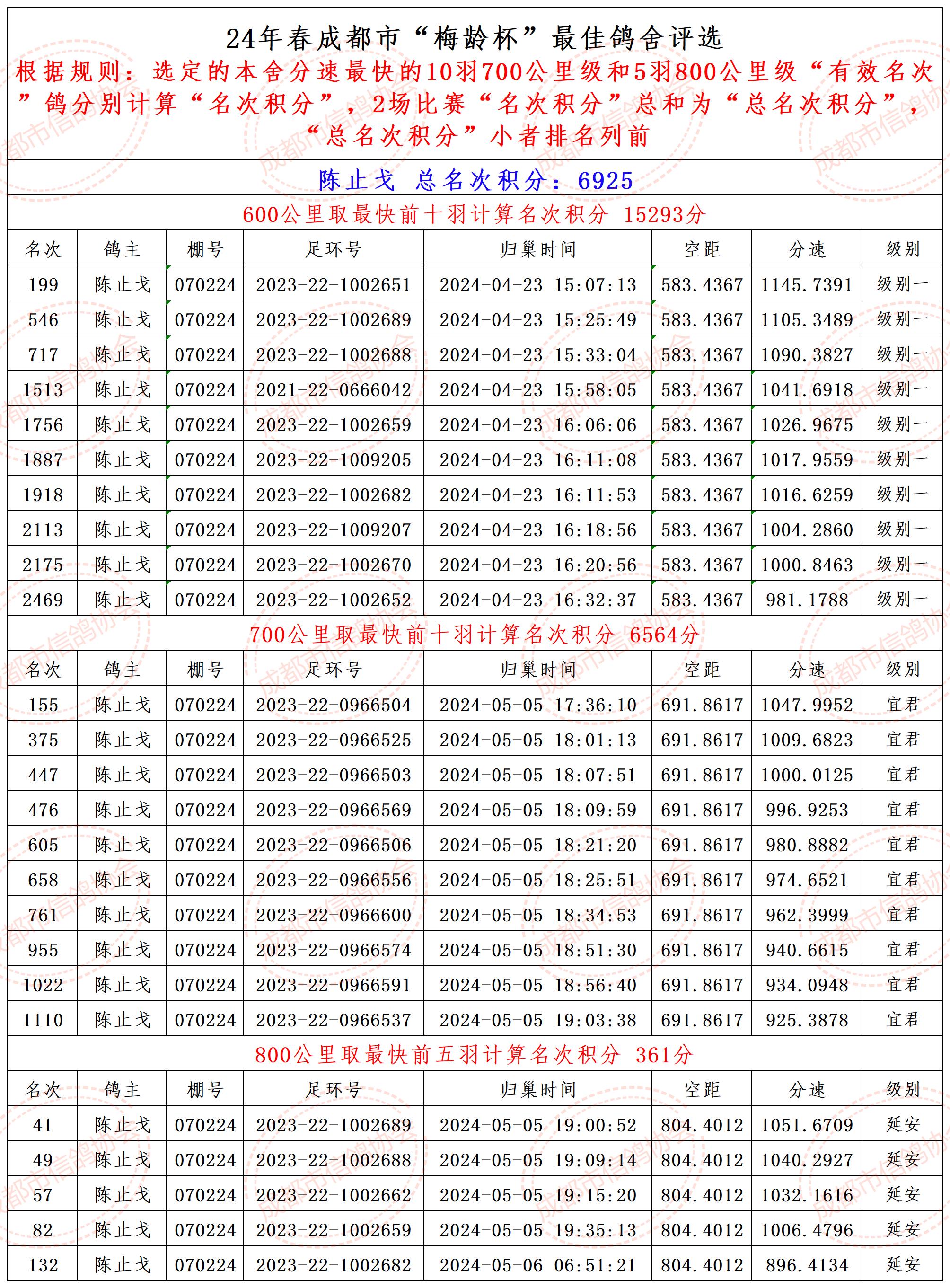 简单介绍一下评选办法:参评“梅龄杯”最佳鸽舍,会员需连续出赛春季600公里甘肃平凉、700公里陕西宜君和800公里陕西延安3场赛事,每场获得“有效名次”的赛鸽数量要求是600公里10羽、700公里10羽、800公里5羽。