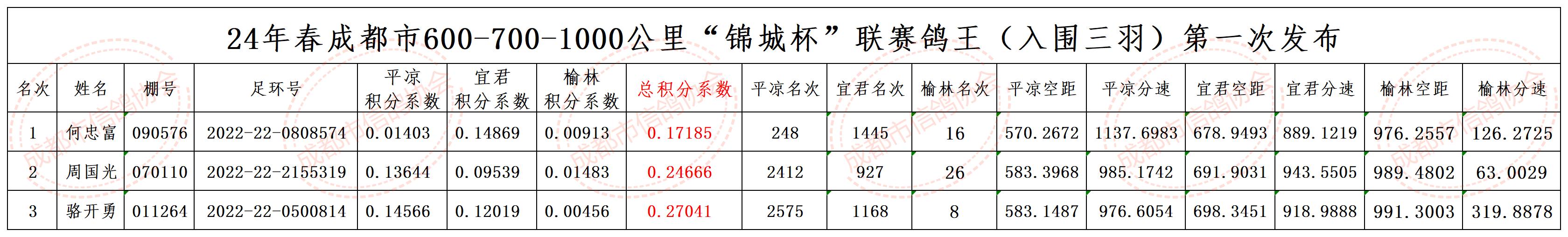 参评“锦城杯”鸽王,同一羽赛鸽必须连续参加市鸽协600公里、700公里和1000公里大联赛且均获得“有效名次”,依据每场“积分系数”计算“总积分系数”,最后排定获奖名单。