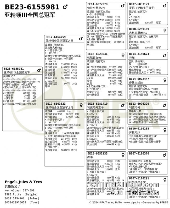 7月14日,比利时亚精顿Ⅲ国家赛在万众期待中圆满结束,赛鸽名家朱尔斯伊夫·英格斯父子鸽舍(EngelsJulesYves)霸气拿下一岁鸽组冠军和20120羽总冠军,这也是英格斯家族累计拿下的第11个全国冠军。