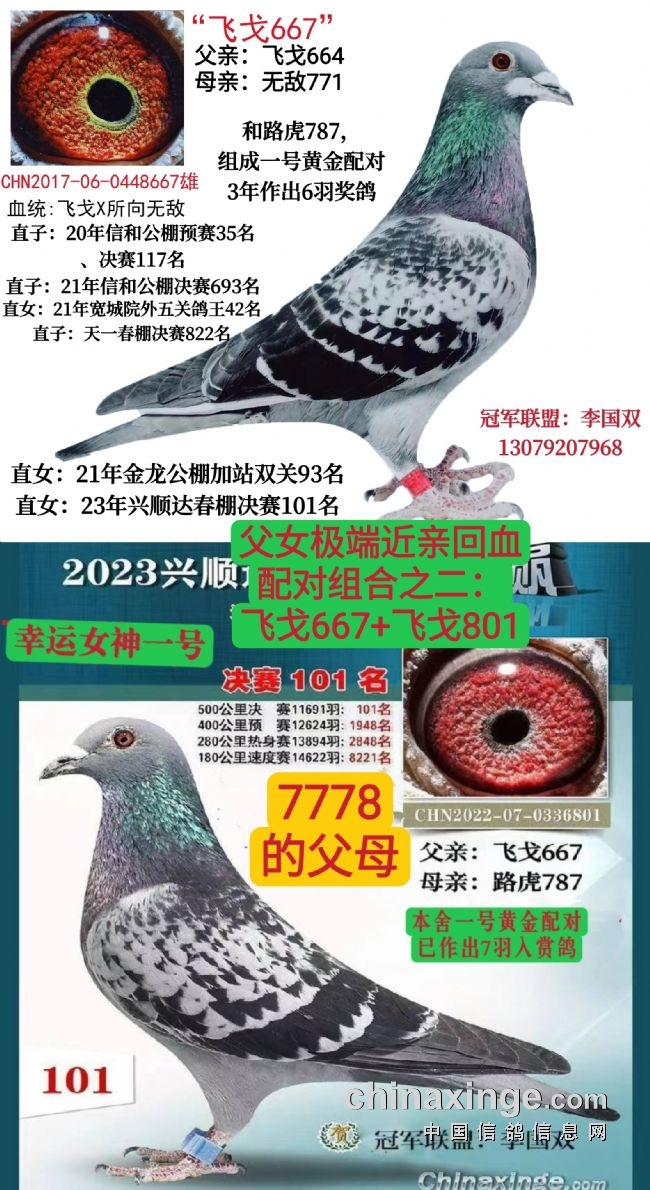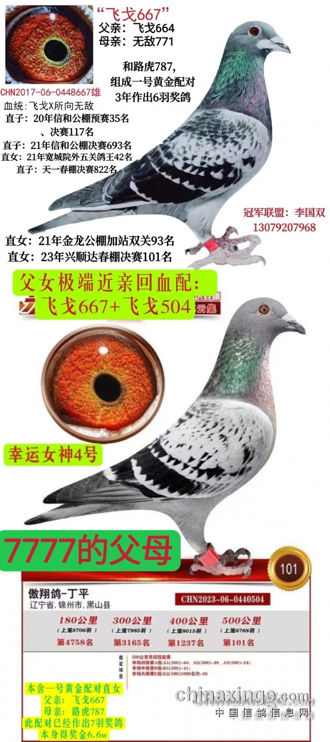 飞戈667已经作育了7羽入赏鸽,飞戈801及飞戈504是飞戈667的两个女儿,801是23年兴顺达春棚的决赛101名,而504是24年兴顺达春棚决赛的101名,同父母姐妹鸽分别连续两年在同一个公棚飞决赛101名,非常地不容易。