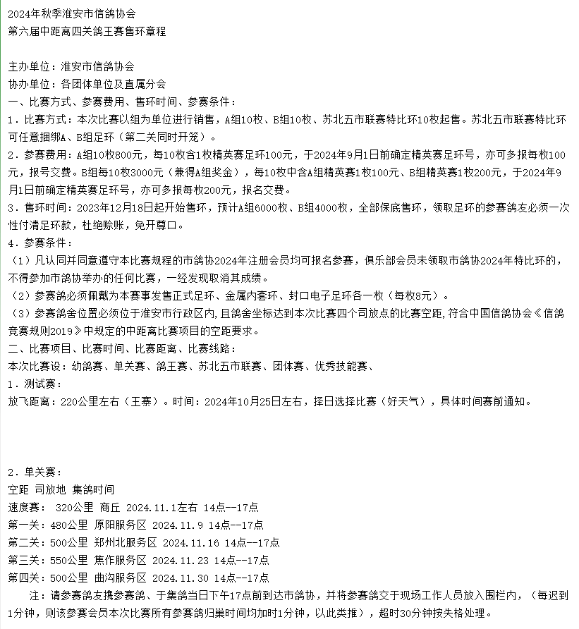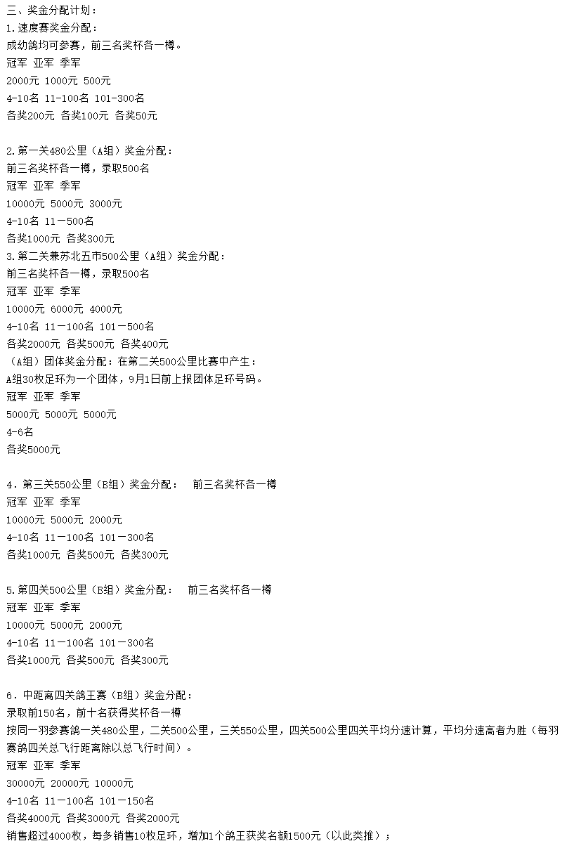 今年四关鸽王赛设有480公里、500公里、550公里、500公里四关,再加上220公里测试赛与320公里速度赛,累计空距超过2500公里。单关冠军奖励10000元,四关鸽王则奖励30000元。查看详情:第六届中距离四关鸽王赛售环章程