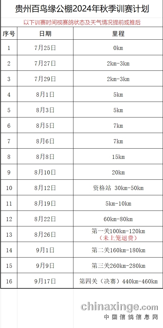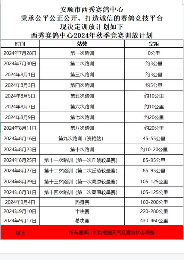 百鸟缘公棚于7月25日进行压笼,今天(7月29日)第二次2公里已经放飞,和翠枫园、西秀公棚进度同步。详细计划如下: