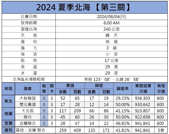 8月4日,2024年台湾北海夏季五关鸽王赛战至第三关比赛,这又是一场艰难的海翔赛,409羽赛鸽同时放飞,3级南风,气温29℃,最终归巢171羽。至此,夏季北海赛事全部结束。