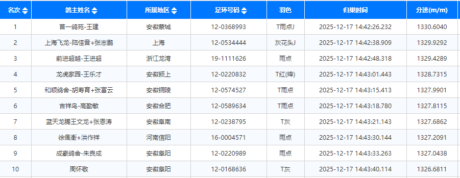 下午14:42,赛鸽们开始归巢。来自安徽蒙城的首一鸽苑-王建,麾下战将12-0368993,于14:42:26顺利打钟,凭借1330.6040米/分的分速,拿下冠军。亚军由上海鸽友上海飞龙-陆佳音+张志鹏拿下,赛鸽环号12-0534444灰花,飞行分速1329.9292米/分。季军则由浙江鸽友前进超越-王进超获得,赛鸽环号19-1111626雨点,打钟时间14:42:48,飞行分速1329.4289米/分。