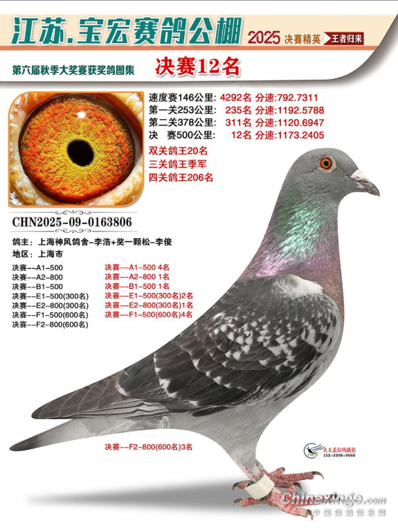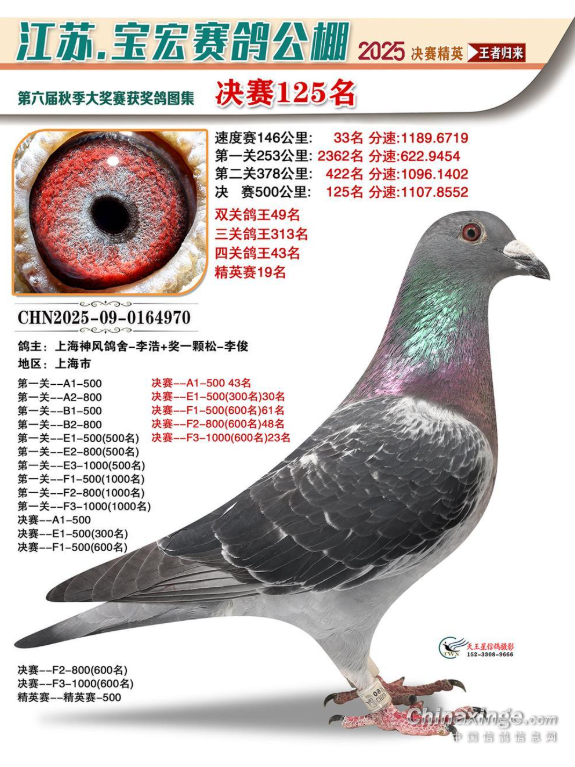 12月17日7点56分,江苏宝宏秋棚500公里决赛在郑州服务区打响,3361羽赛鸽迎风启程。15点2分,上海神风鸽舍的09-0163806雨点,以1173.2405米/分的分速强势冲线,勇夺第12名!紧随其后,09-0164970亦稳稳报进,斩获第125名。
