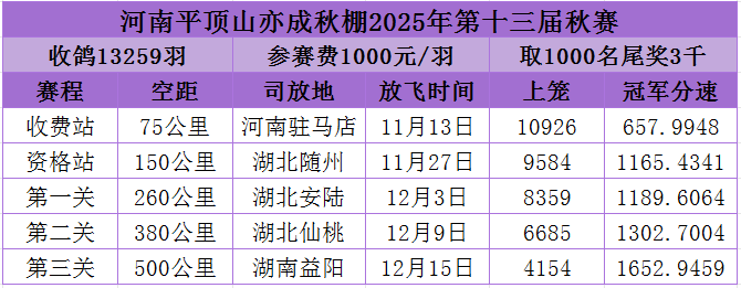 不负信任,不负荣光,诚心办赛。专为工薪鸽友打造公平、公正、高性价比的竞技舞台——让每一份热爱,都有机会闪耀赛场。2025年秋赛参赛费仅1000元/羽,决赛豪气取奖1000名,回馈每一位执着追梦的爱鸽人!11月13日,75公里收费站在河南驻马店泌阳率先打响,上笼10926羽。本场比赛虽遇艰难,却依旧取得超九成归巢的好成绩。小将们锋芒尽显,放万羽归万羽,赢得满堂彩。11月27日,150公里资格站在湖北随州市开启,上笼参赛9584羽。本场比赛强势接力,近九成赛鸽凯旋,士气如虹。紧接着,正赛大幕拉开,一场场更高强度、更富悬念的对决,也随之而来。