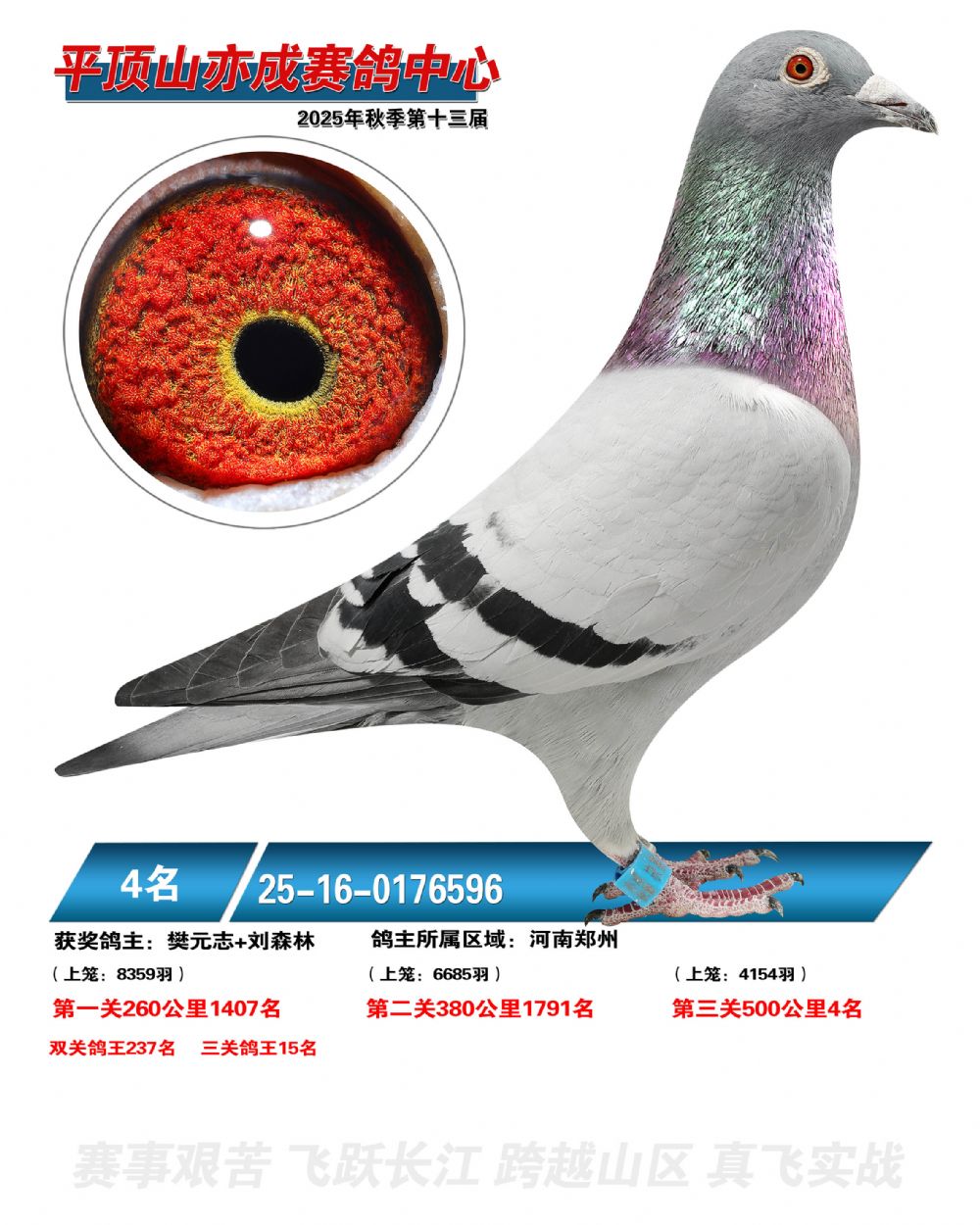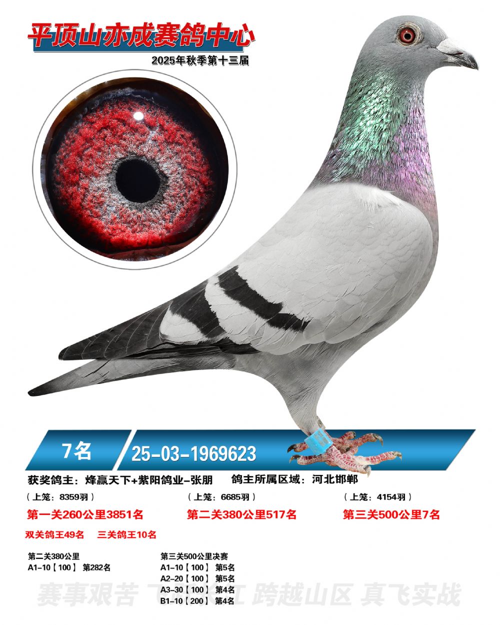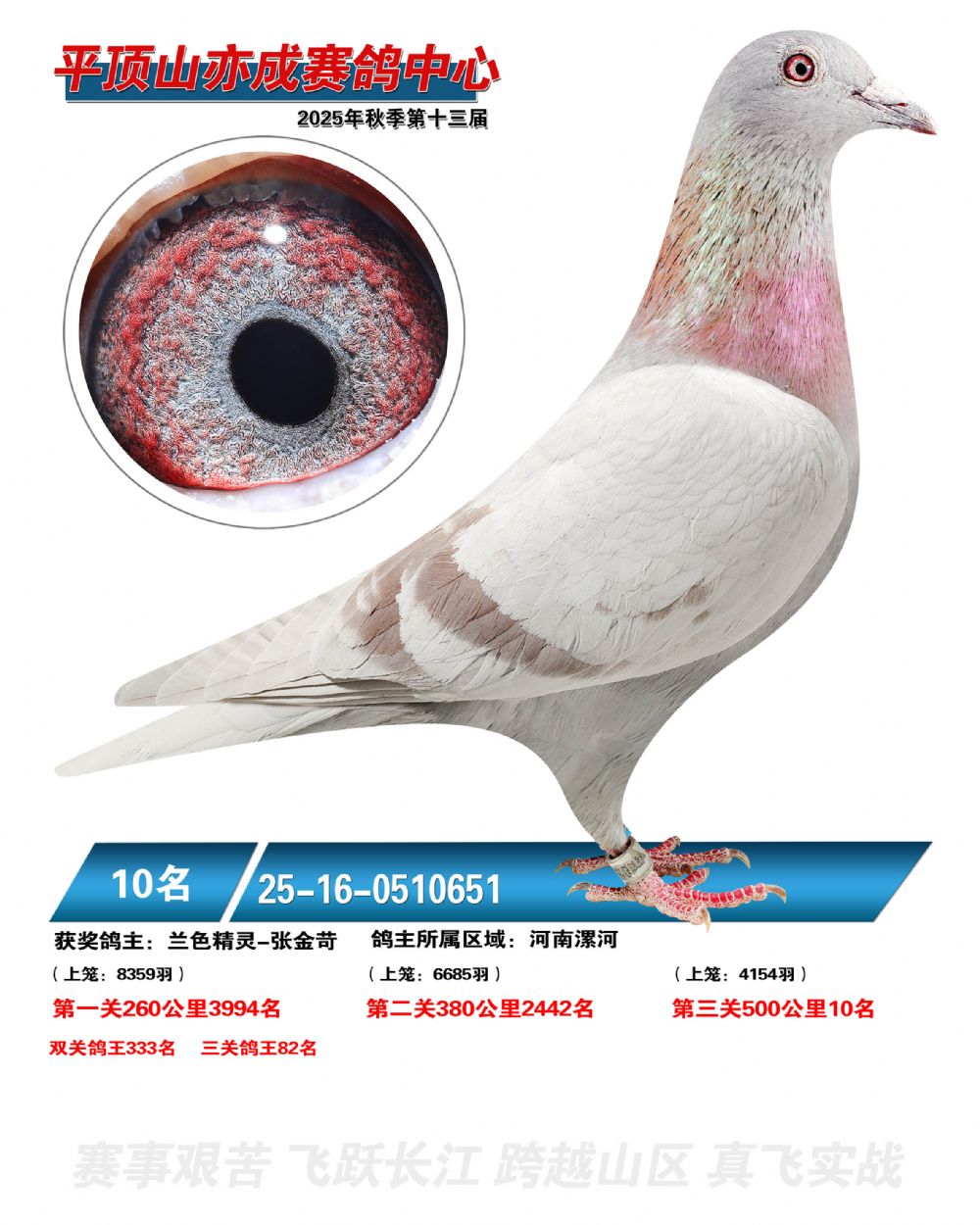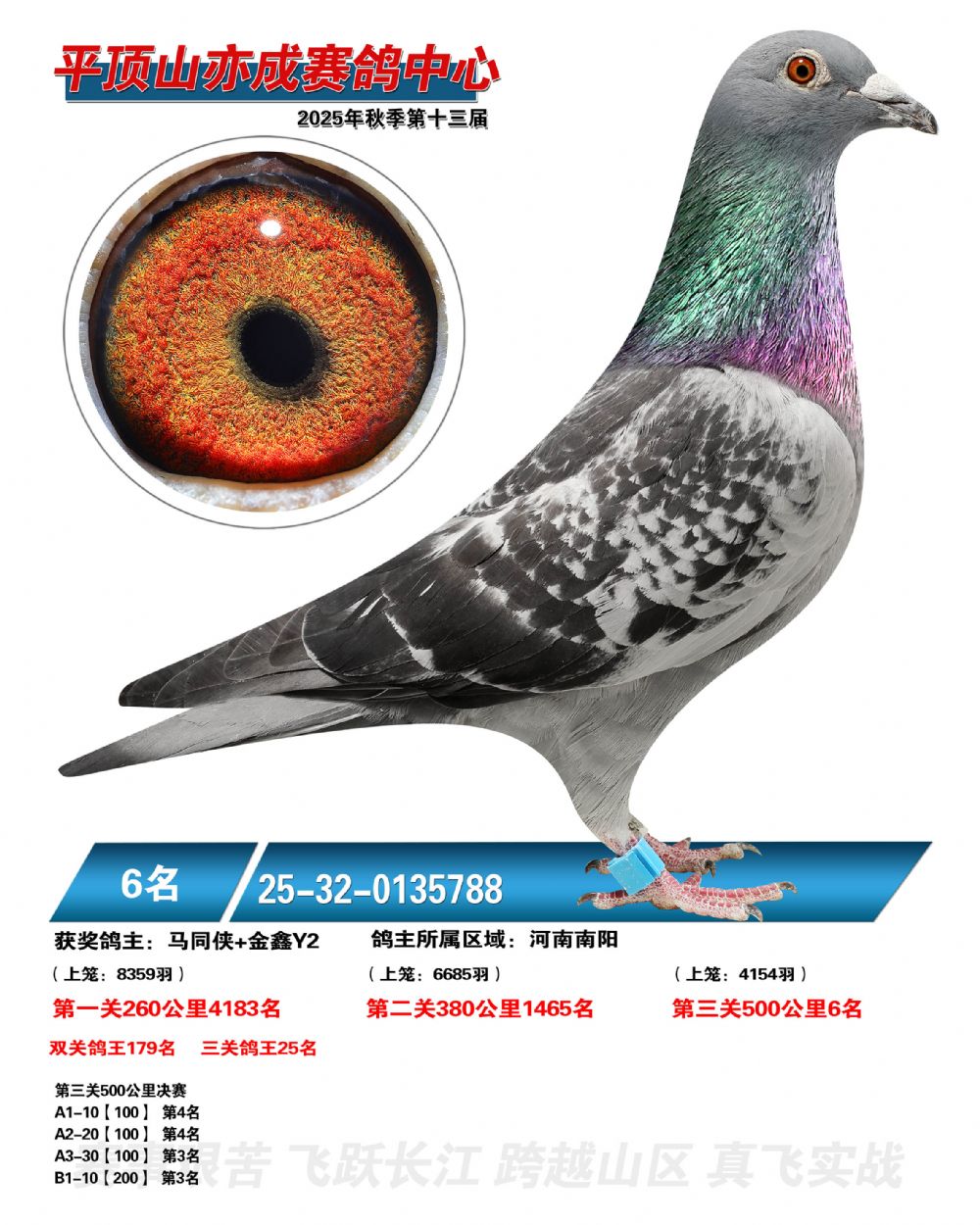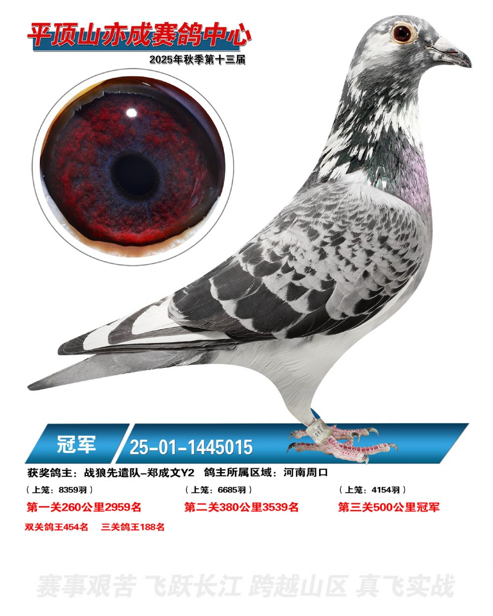 十三载匠心办赛,十三届实战选将——河南平顶山亦成秋棚,以严苛铸标准,以豪情续新篇。2025秋赛,跃长江、跨峻岭,十四站训放淬火成钢,收费站、资格站、三关正赛试炼,只为遴选实战真英雄。2025秋赛再创辉煌,本届收鸽13259羽,穿越层层关卡,至决赛一千多羽精英杀出重围,羽羽皆英豪。最终,战狼先遣队-郑成文麾下猛将,环号2025-01-1445015雨花一骑绝尘,以1652.9459米/分的高分速斩获决赛冠军。三关鸽王冠军之争,同样扣人心弦。此项最高荣誉由周根尚名下悍将实力加冕!此鸽环号2025-16-0329282,以首关271名、二关135名、决赛34名的精彩表现夺得。这羽0329282三关鏖战毫不退缩,以稳制胜,最终积小胜为大胜,荣登鸽王冠军宝座。