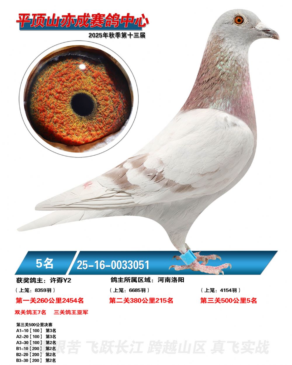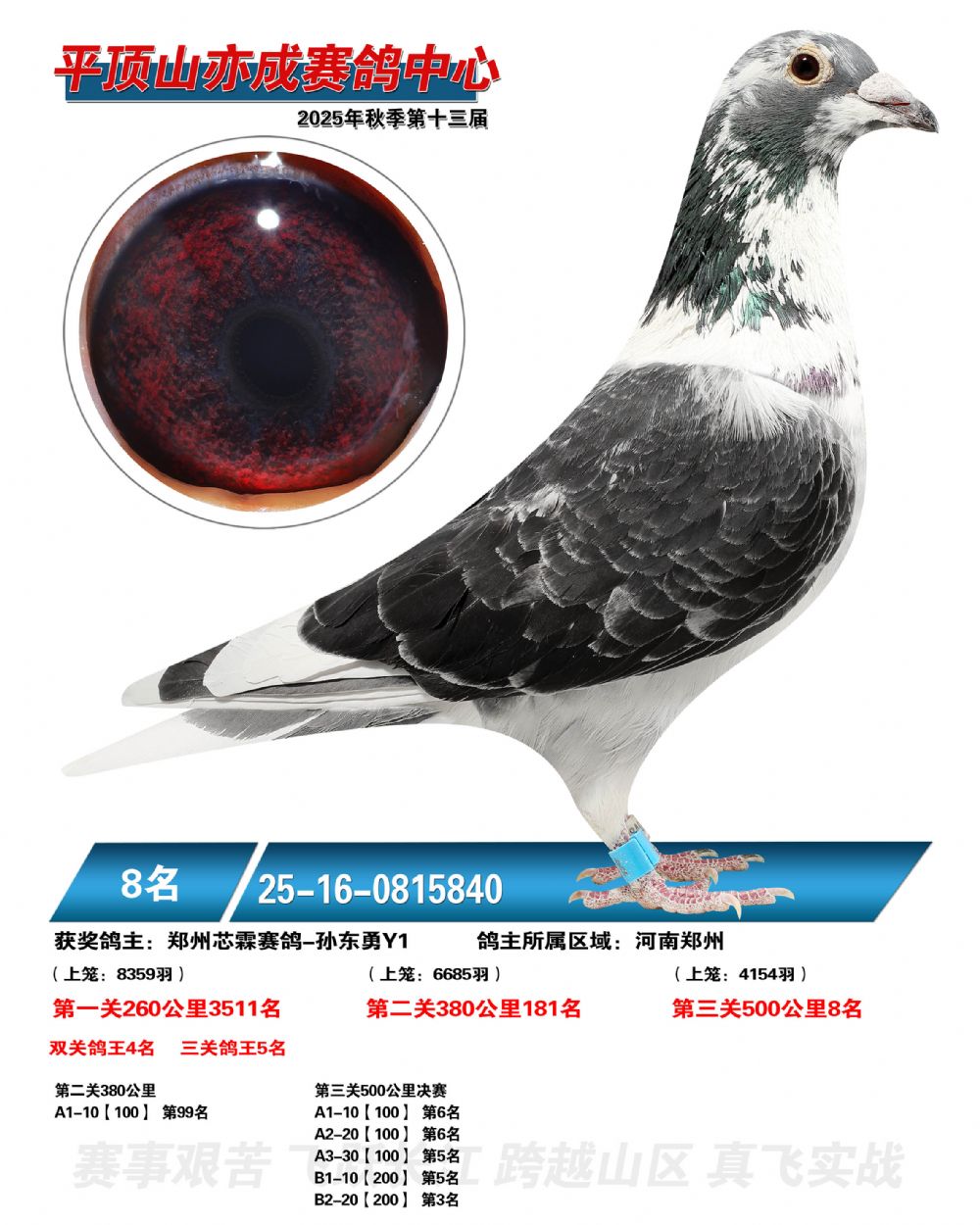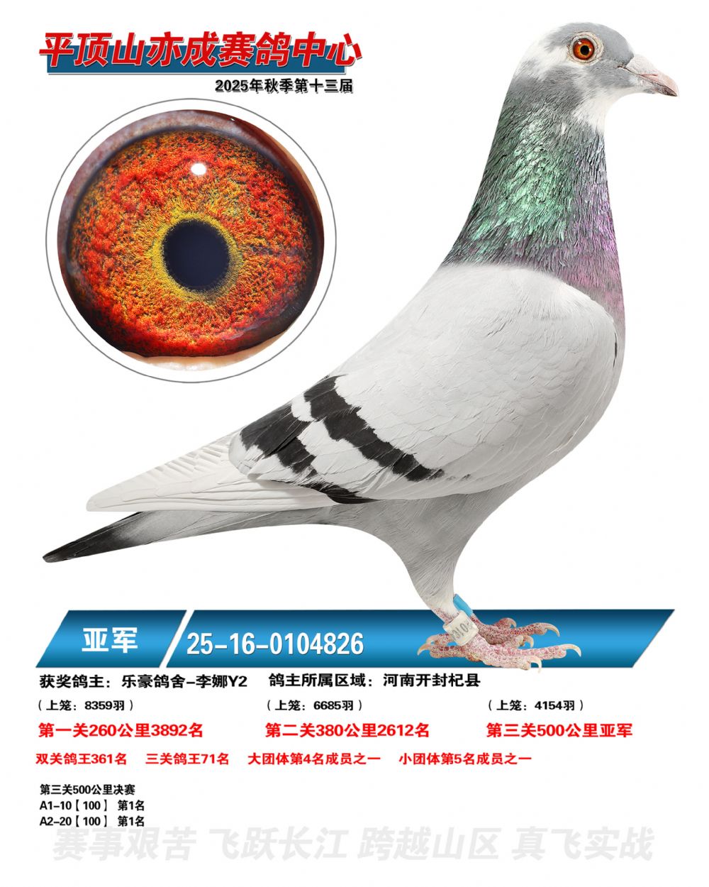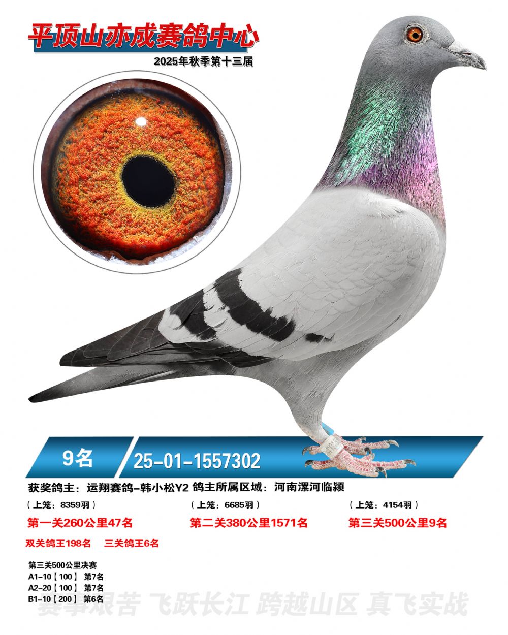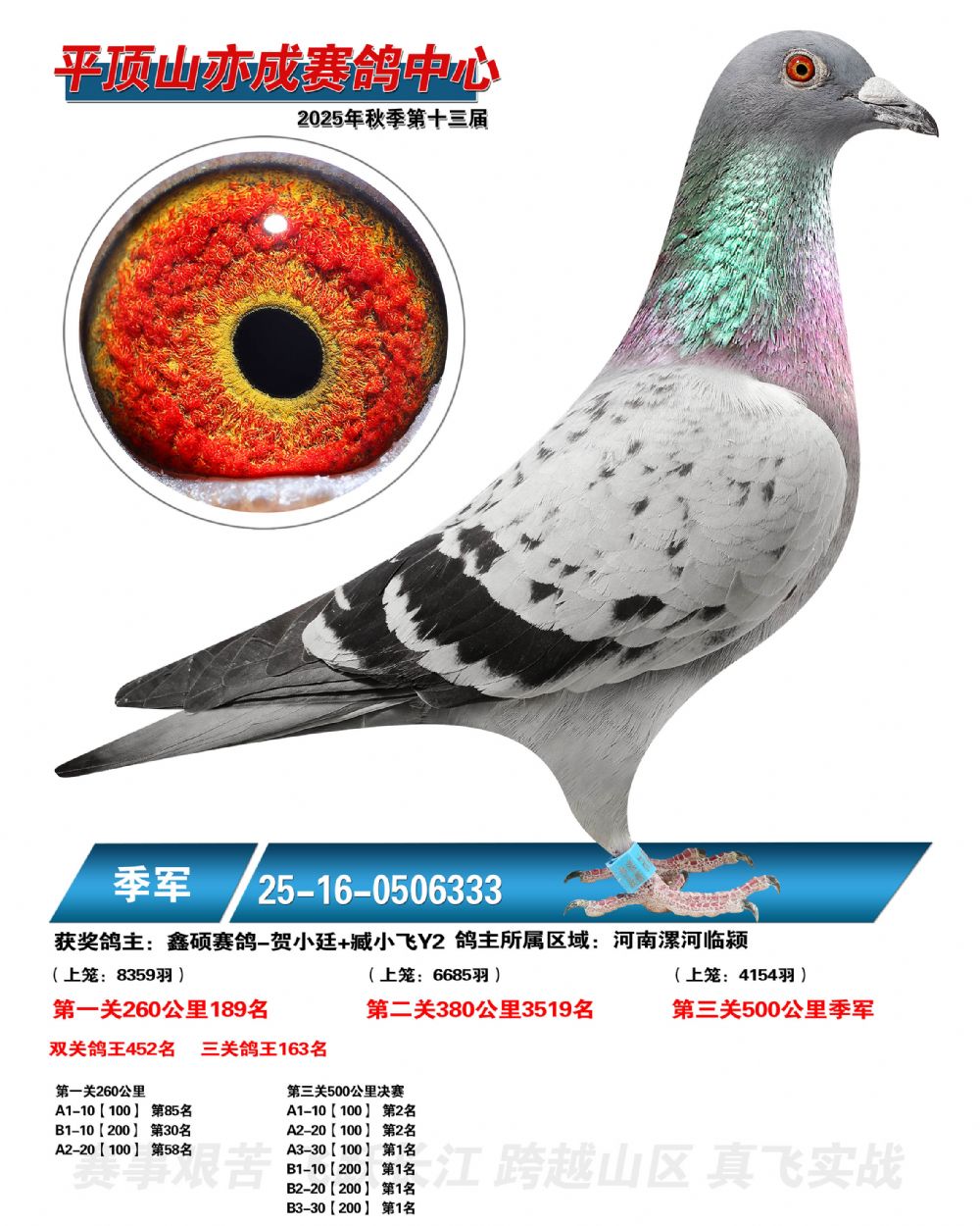 十三载匠心办赛,十三届实战选将——河南平顶山亦成秋棚,以严苛铸标准,以豪情续新篇。2025秋赛,跃长江、跨峻岭,十四站训放淬火成钢,收费站、资格站、三关正赛试炼,只为遴选实战真英雄。2025秋赛再创辉煌,本届收鸽13259羽,穿越层层关卡,至决赛一千多羽精英杀出重围,羽羽皆英豪。最终,战狼先遣队-郑成文麾下猛将,环号2025-01-1445015雨花一骑绝尘,以1652.9459米/分的高分速斩获决赛冠军。三关鸽王冠军之争,同样扣人心弦。此项最高荣誉由周根尚名下悍将实力加冕!此鸽环号2025-16-0329282,以首关271名、二关135名、决赛34名的精彩表现夺得。这羽0329282三关鏖战毫不退缩,以稳制胜,最终积小胜为大胜,荣登鸽王冠军宝座。