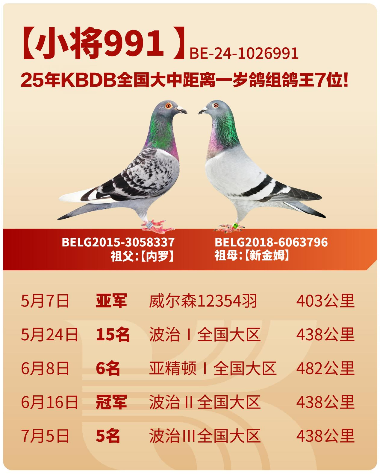 25赛季,其孙代马里斯莫闪耀西班牙赛场,夺得马里斯马大师公棚两场热点赛的冠军;内罗及其黄金搭档新金姆,作育孙代小将991,接连斩获威尔森12354羽亚军、波治II全国大区冠军、波治I全国大区15名、亚精顿I瓦隆大区6名、波治III瓦隆大区5名、波治IV瓦隆大区6名,最终登顶25年比利时中距离全国5场比赛最佳一岁鸽冠军、KBDB全国中距离一岁鸽组鸽王7名!