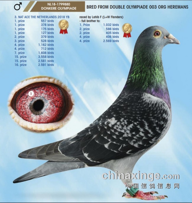 深斑880,本身就是赛场常胜将军,超级七冠王,18年全国长距离幼鸽王季军,速度、耐力、稳定性,三项齐备。它的血脉,更立于竞翔之巅。父亲双重003,利奥传奇铭鸽,奥林匹克速度鸽王003直子与直女的近亲结晶。母亲加隆954,NPO赛场冠军,出自丹尼·凡戴克4羽KBDB鸽王之父加隆348。
