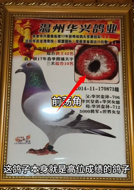 华兴新金母,这一个是3年配了3个雄鸽,做出两个冠军、鸽王10名。亲兄弟又做出开尔的冠军。像这种眼睛,它的底板整个是露底的,底板表示它的承受力,外封砂表示它的力度,前荡角破口表示速度,它本身就是高位成绩鸽,子代3年做两个冠军,孙代就不得了了。