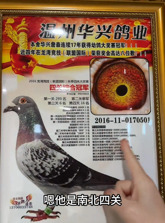 这个是龙湾南北四关鸽王的总冠军,正南正北几乎每次都是第一批到的鸽子,而且最难得的,16年龙湾唯一一次圆满完赛四关,它打完了。龙湾13、15年是南北四关都只打到第三关,第四关就灭关了。前23名的综合鸽王里面,这羽鸽子是唯一一个雄,其它都是雌。