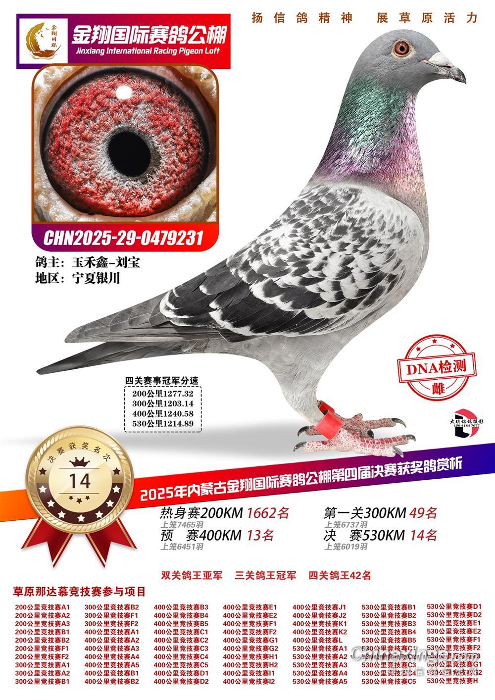 11月下旬,2025年第四届“金翔杯”秋季大奖赛圆满落幕。赛事历经200公里热身赛、300公里资格赛、400公里预赛,最终迎来530公里终极决战。来自玉禾鑫-刘宝的雨点赛鸽(2025-29-0479231)凭借首关第49名、预赛第13名、决赛第14名的稳定发挥,成功加冕三关鸽王冠军——三关均跻身前五十,全程无短板,赛场统治力无可匹敌。