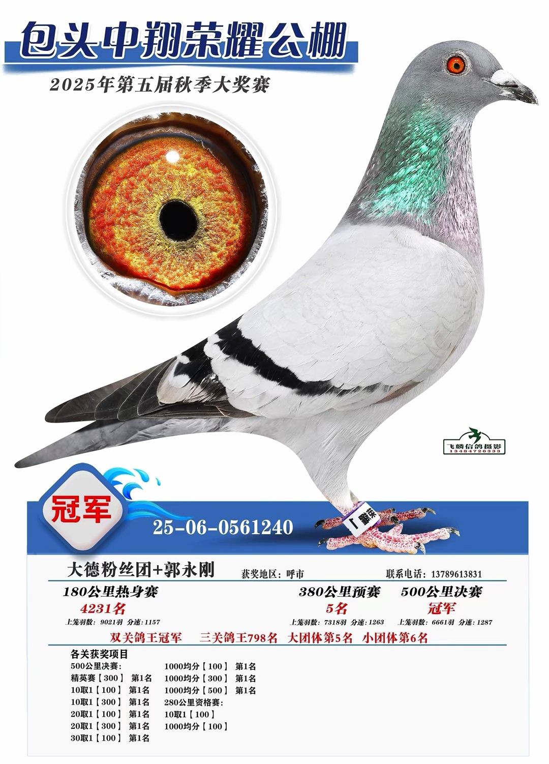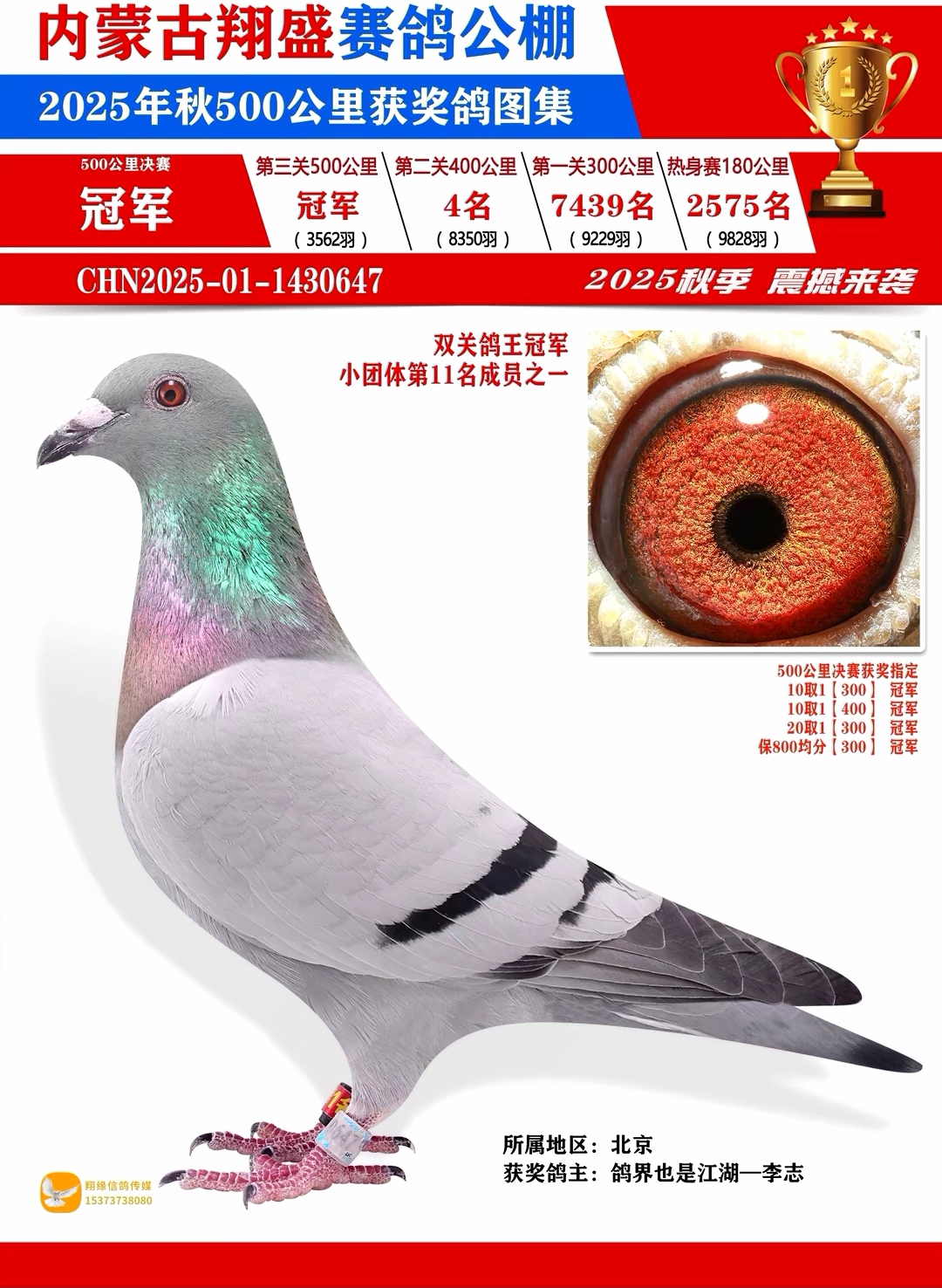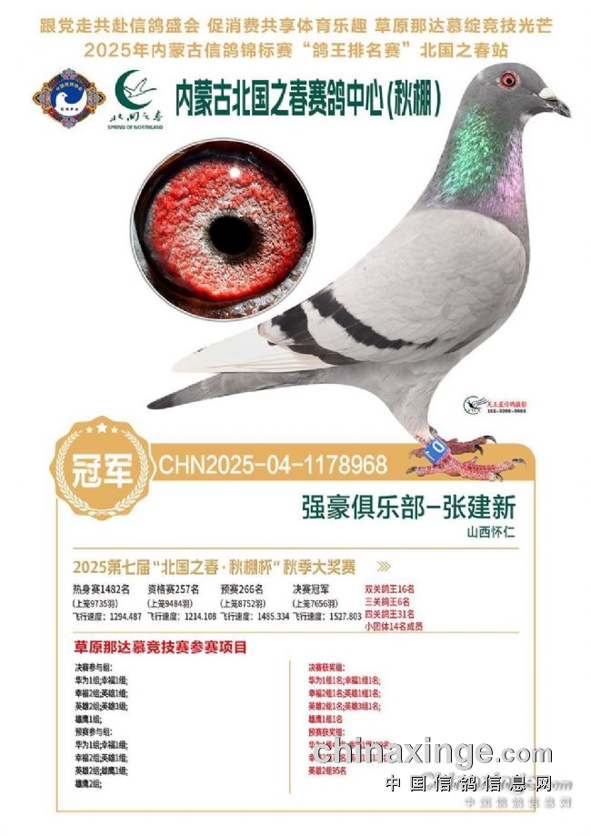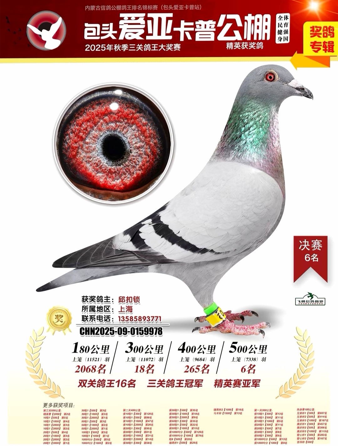 金秋十月末,2025年包头爱亚卡普公棚秋季三关鸽王大奖赛落下帷幕。从300公里资格赛起步,经400公里预赛淬炼,再到500公里终极决战,至决赛日仍高达7300余羽参赛!在这场硬战中,一羽来自上海鸽友邱扣锁麾下的灰鸽(2025-09-0159978)如利剑出鞘,以资格赛第18名、预赛第265名、决赛高居第6名,一路稳定而强势表现,最终力压群雄,勇夺三关鸽王总冠军!