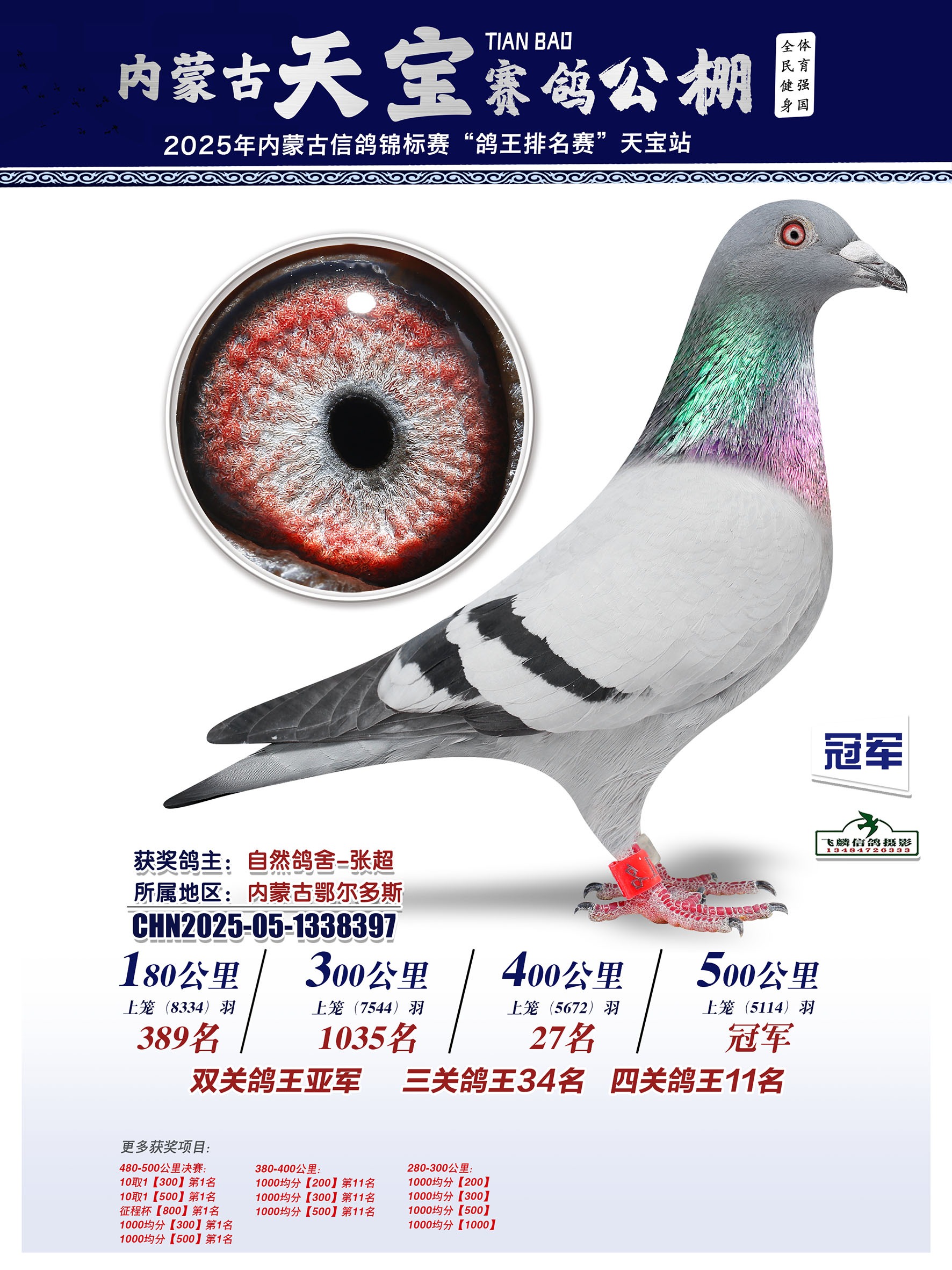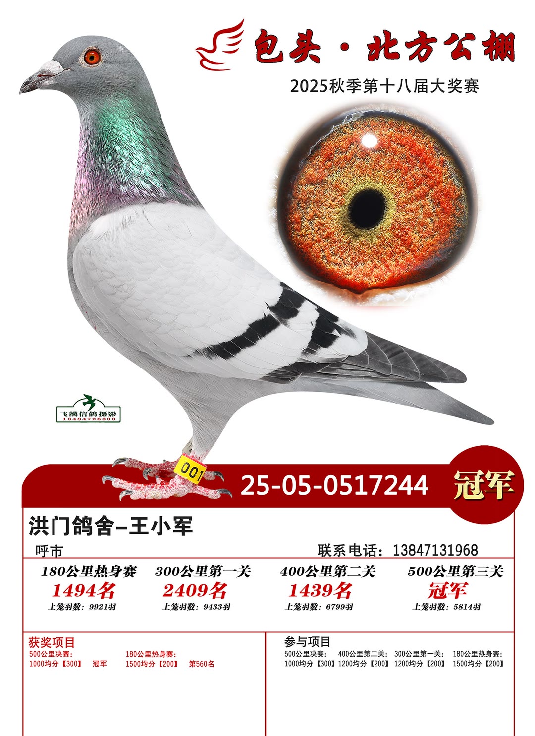10月27日,北方公棚第十八届“感恩杯”500公里秋决赛在正蓝旗开笼,集鸽5814羽。经过7个多小时的激烈角逐,洪门鸽舍-王小军的灰鸽(05-0517244)率先踏钟归巢,以1153.964米/分的成绩摘得桂冠。令人惊叹的是,此鸽在热身赛至预赛阶段始终徘徊于千名开外,却在最关键的决赛中爆发出惊人潜力,在赛场上演了一出“黑马逆袭记”,厚积薄发!