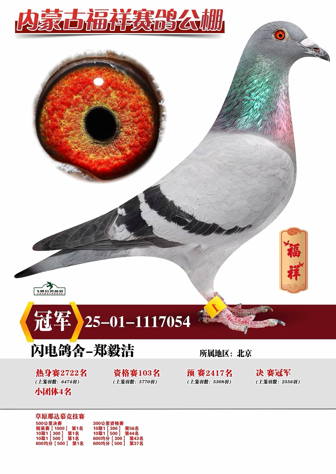 11月23日,福祥公棚第二届秋决赛于宁夏银川开笼,集鸽2556羽,实际空距506.843公里。本场赛事不仅归巢率突破八成,更诞生了一羽“速度王者”——闪电鸽舍-郑毅洁的灰鸽(2025-01-1117054)以1872.3803米/分的高分速强势夺冠,掀起一场竞速狂潮。尽管其前期表现起伏不定,热身赛第2722名、资格赛第103名、预赛第2417名,但决赛中再度释放巅峰战力,以绝对速度碾压群雄豪取冠军,关键时刻定乾坤。