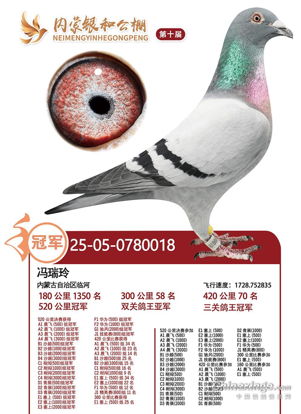11月11日,银和公棚第十届秋季决赛在银川市开笼,集鸽4727羽,参考空距520公里。冯瑞玲鸽友的战将率先报进,以惊人的1728.7528米/分分速摘得桂冠!此鸽不仅决赛速度惊人,全程表现亦极为稳定:首关第58名、二关第70名、三关强势夺冠,凭借持续高位发挥,成功揽获双关鸽王亚军及三关鸽王冠军。骁勇善战,步步为营,真正飞出了属于自己的硬核实力。
