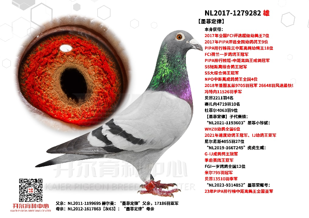 这羽鸽王亚军的血脉底蕴尤为深厚,根植于有“荷兰巨炮”之称的威廉迪布恩核心血脉,是当家种雄、四获鸽王冠军的“墨菲定律”及其同父弟弟的近亲作育,更是奥林匹克名鸽“飓风号”的双重回血结晶。其父亲是“墨菲定律”的同父弟弟,源自墨菲定律父亲赫尔曼与玛莉安娜027的结合,赫尔曼自身曾斩获南图17186羽亚军,玛莉安娜027则是奥林匹克飓风外孙女,自身亦有19年SS当日归长距离鸽王季军的亮眼战绩;母亲则是“飓风号”直孙与“墨菲定律”直女两大王牌血系的顶级融合,实战基因与生俱来,这也正是它能在全球顶尖赛事中脱颖而出的关键所在。