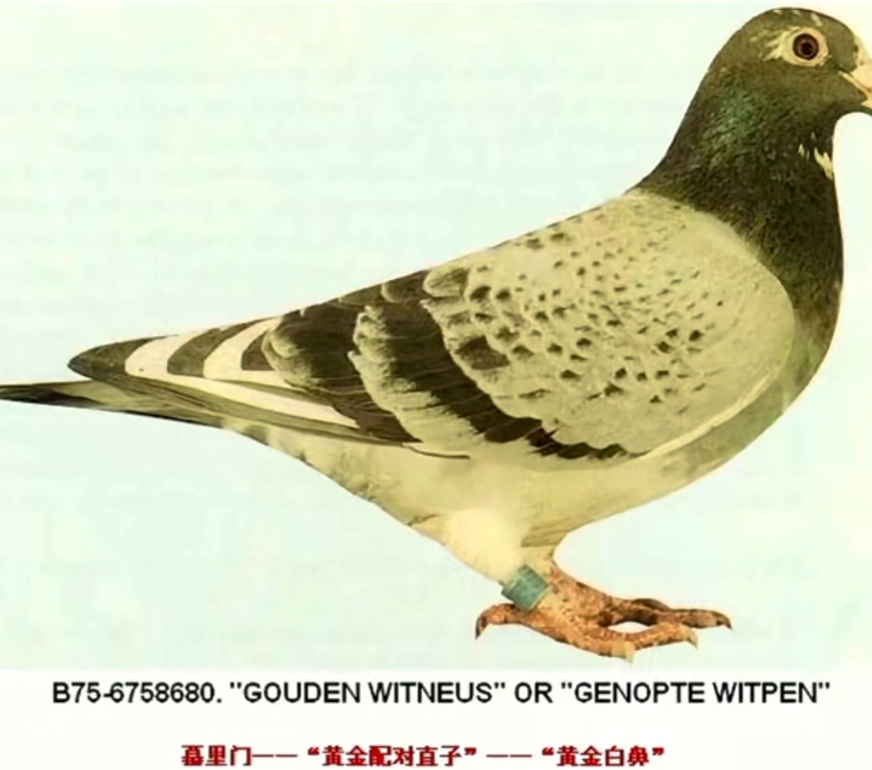 大名鸽“白鼻号”,全称为“黄金白鼻号”,诞生于1973年,环号B75-6758680,是一羽气质非凡的灰斑雄鸽。它是慕利门“黄金配对”老凡登布希的直子,出身显赫。“白鼻号”的兄弟们也十分出色,包括大名鼎鼎的“麦克斯”、“军校生”、“年轻号”、“漂亮深斑”等,此外还有超过一打的其他超级赛鸽,家族阵容超强。