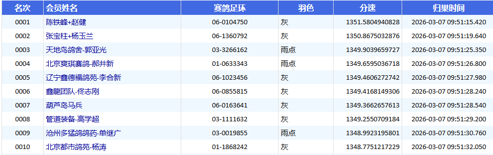 9点51分,第一梯队快速归来,一分钟内共计72羽报进。陈铁峰+赵健的06-0104750灰鸽勇夺第一,平均分速1351.5804米/分。随后张宝柱+杨玉兰的06-1360792灰鸽拿下亚军,平均分速1350.8675米/分。季军则由天地鸟鸽舍-郭亚光的03-3266162雨点摘得,平均分速1349.9039米/分。
