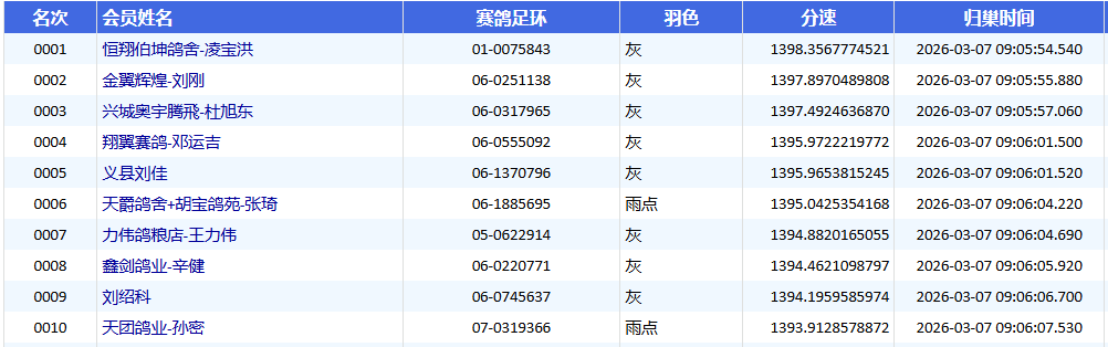 一小时后,恒翔伯坤鸽舍-凌宝洪名下01-0075843灰鸽报进,以1398.3567米/分的速度斩获本场冠军。1秒后,金翼辉煌-刘刚的06-0251138灰鸽摘下亚军,平均分速1397.8970米/分。兴城奥宇腾飛-杜旭东06-0317965灰鸽随后拿下季军,平均分速1397.4924米/分。