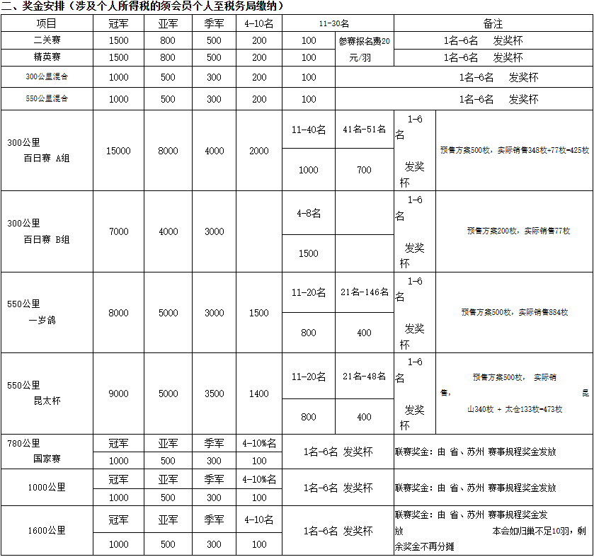 作为本次春季竞翔计划的压轴大戏,1600公里江苏省兰州超远程大赛不仅距离最远,奖金设置方面:前10名均有奖励,冠军1000元,亚军500元,季军300元,第4至10名各奖100元,前六名奖励精美奖杯一座。按规定,若最终归巢不足10羽,剩余奖金不再重新分配。