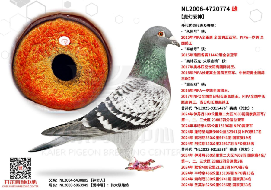 就是这羽魔幻爱神成为开尔魔法家族的奠基之雌,其血脉如星火燎原,横纵贯穿于开尔的魔法家族,魔幻爱神又与几只雄鸽育出多羽顶尖赛将,堪称黄金配对,这几羽雄鸽是幸存者:03年利芬奥林匹克中距离鸽王冠军、安迪莫雷:13年顶翼长距离国家鸽王亚军、守护者:利曼斯国家赛15252羽冠军、克瑞尔冠军燧石号、无敌号、霍克船长、毕加索、法拉利、独眼大盗。