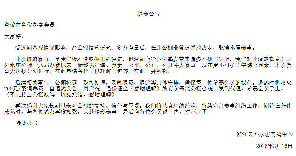 3月16日,浙江云外水庄赛鸽中心发布退赛公告,宣布取消本届赛事。点击查看原公告