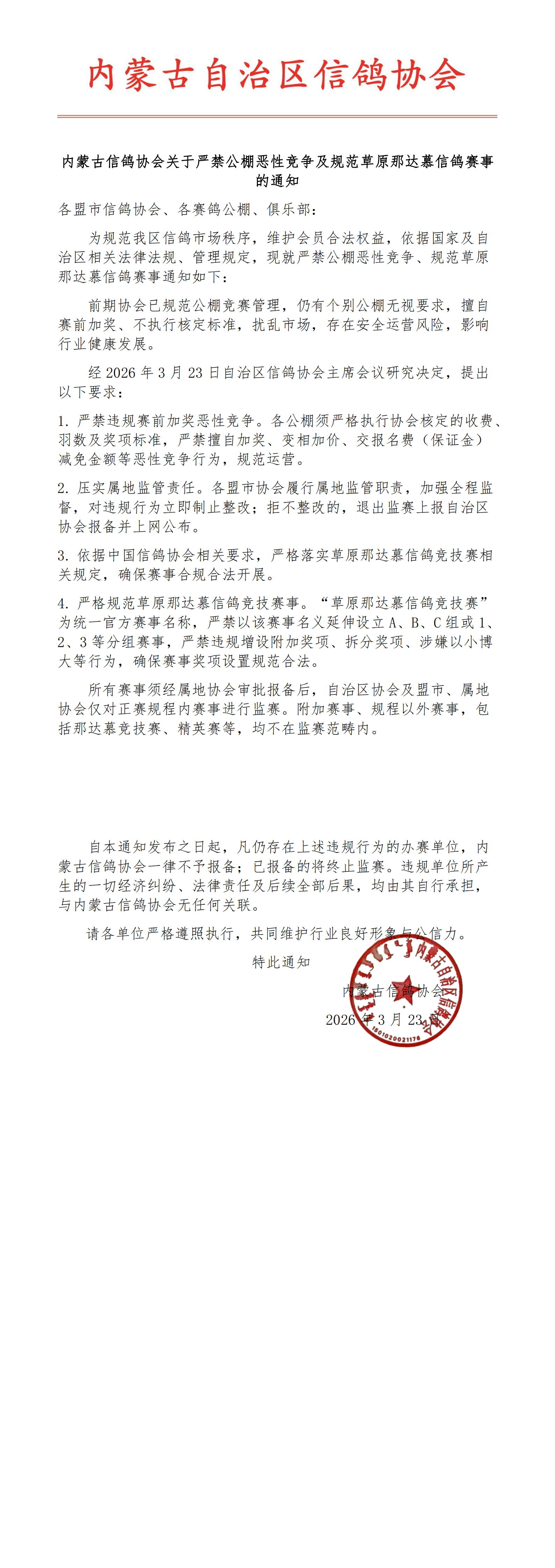 3月23日,内蒙古信鸽协会发布一则《关于严禁公棚恶性竞争及规范草原那达慕信鸽赛事的通知》,通知中说明: