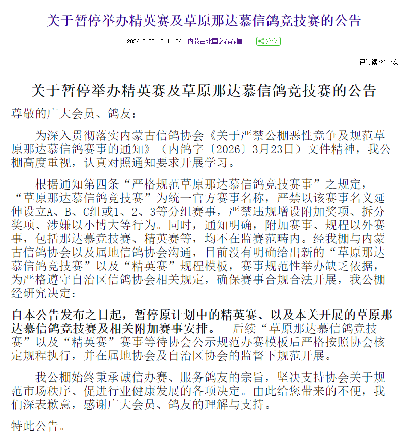 3月25日,北国之春公棚宣布“暂停规程原计划中的精英赛、以及本关开展的草原那达慕信鸽竞技赛及相关附加赛事安排”。
