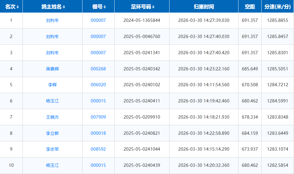 下午14时刚过,随着第一羽赛鸽划破长空,比赛陆续有鸽归巢。14时27分39秒,鸽友刘利冬一连报进三羽,豪取比赛前三,展现了统治级的实力。