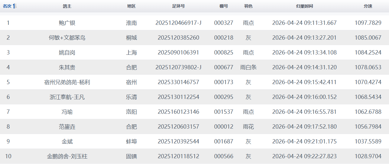 紧接着,鸽友姚自岗的一羽2025090106391雨点踩钟报进,分速1084.2524米/分,获得季军荣誉。