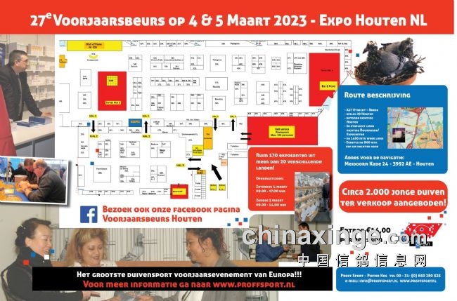 2023年3月4日,荷兰春季信鸽博览会将在阿姆斯特丹南部城市豪腾展览中心(Expo Houten)开幕,会期为期2天(3月4日-3月5日)。预计,今年将有荷兰、比利时、德国、葡萄牙、英国等20多个国家、约170家参展商家参展。