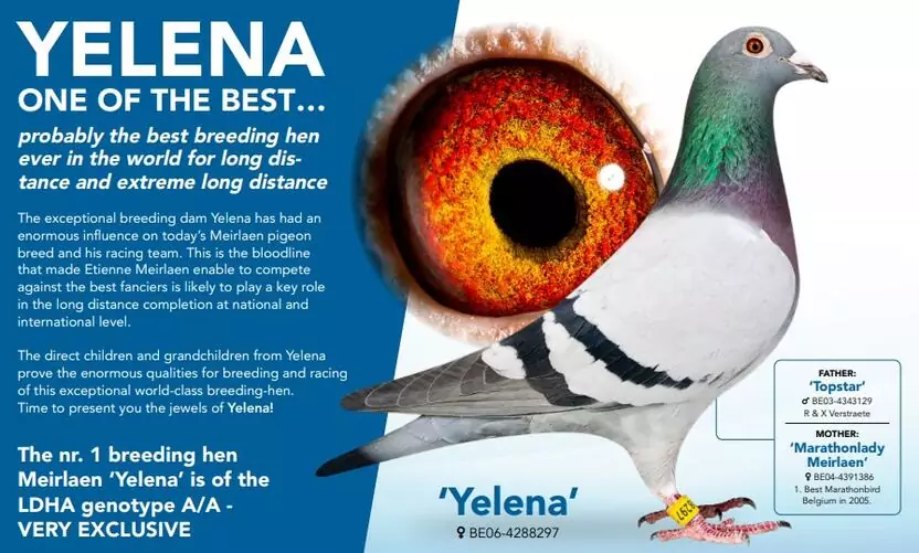 更令人称奇的是科学的验证。DNA检测显示,伊莲娜拥有极为罕见的LDHA基因A/A型。(AA基因型相当罕见:只有不到1%的赛鸽拥有,而且多数见于冠军和鸽王)。