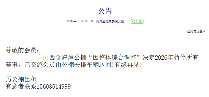 4月1日晚19点,山西金海岸赛鸽公棚发布一则公告称,因整体综合调整,公棚决定2026年暂停所有赛事。已交鸽会员由公棚安排车辆送回!有缘再见!