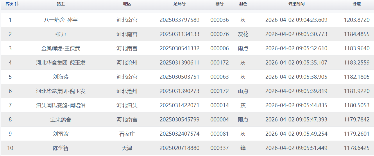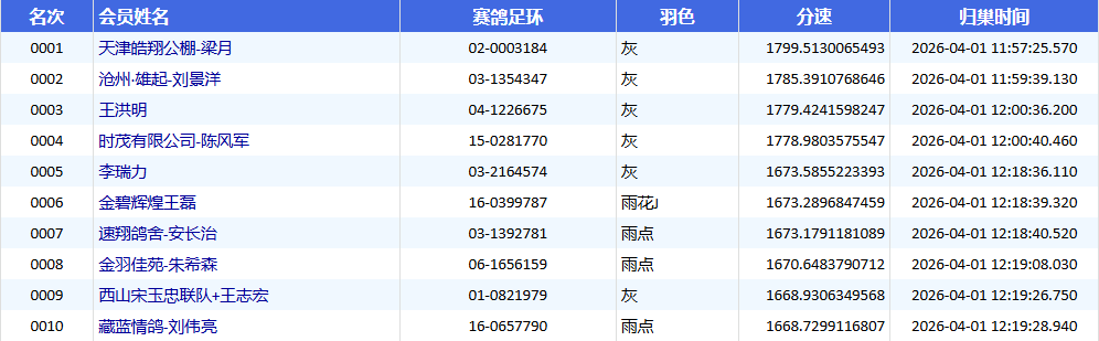 当天中午11时57分,第一梯队赛鸽如离弦之箭般高速归来。经过激烈的角逐,天津浩翔公棚-梁月的一羽足环号为02-0003184的灰鸽率先冲入鸽棚,以1799.5130米/分的惊人分速斩获冠军,展现了超凡的爆发力。沧州·雄起-刘景洋的03-1354347灰鸽紧随其后,以1785.3910米/分的分速锁定亚军。王洪明选送的04-1226675灰鸽则以1779.4241米/分的分速荣获季军。截至4月2日早9时30分,本场决赛共归巢861羽,归巢率为23.38%。点击查看直播